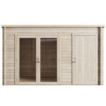 The side storage unit is divided from the indoor room by a partition wall. This wall is adjustable and allows the storage to be either increased or decreased in size depending on your needs and preferences, giving you amazing versatility with the building and how you use it. The cabin itself comes in two sizes, either 12x8ft or 14x8ft, allowing you to choose a model that fits your preferences.