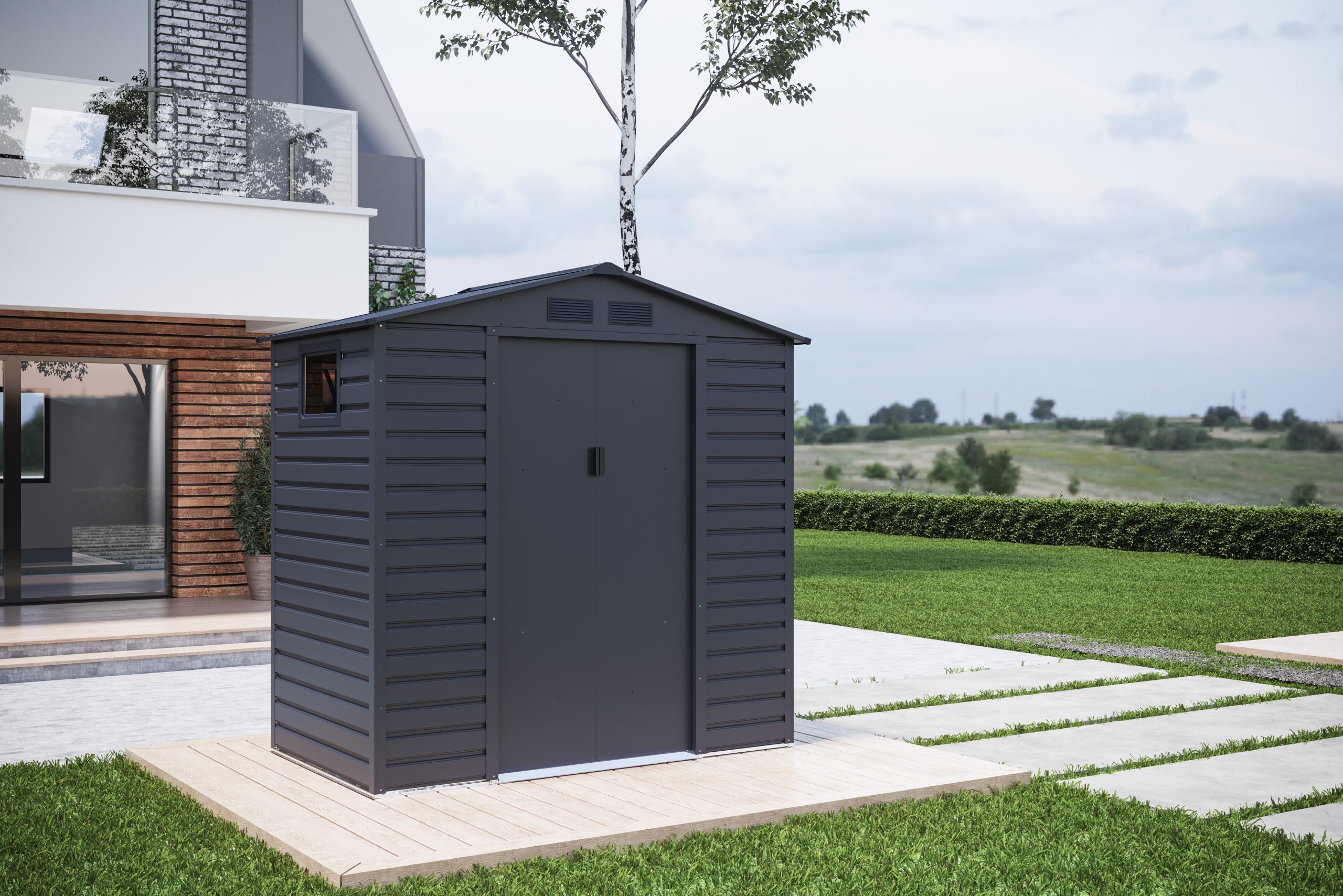 A modern and stylish metal shed, the Titan gives you functional storage in a secure, attractive unit. Equipped with a flat roof and skylights that…